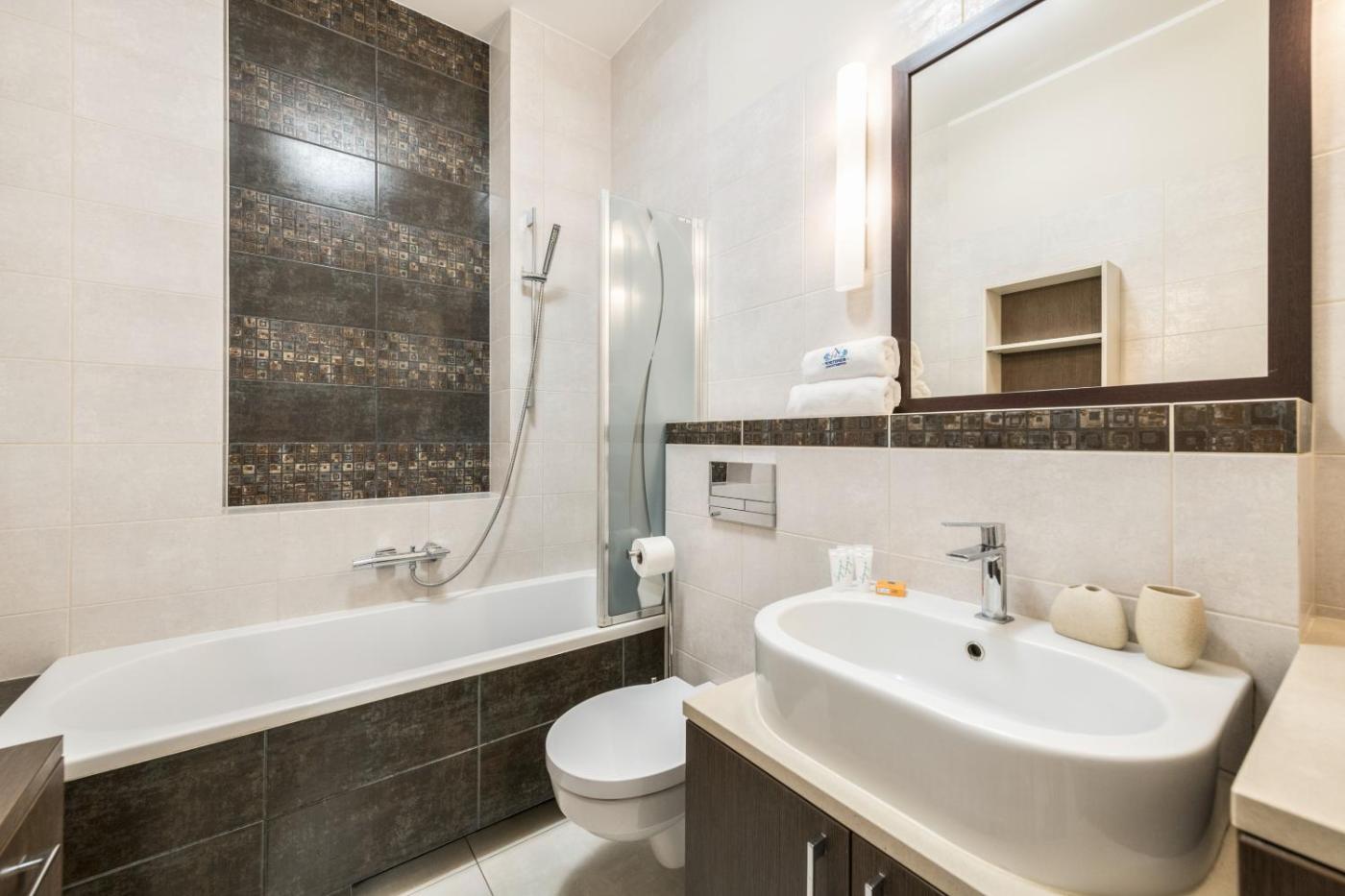 W apartamencie z 1 sypialnią zapewniono salon z telewizorem z płaskim ekranem z dostępem do kanałów kablowych, aneks kuchenny z pełnym wyposażeniem, w tym lodówką i zmywarką, a także łazienkę (1) z suszarką do włosów. W apartamencie zapewniono ręczniki i pościel.
